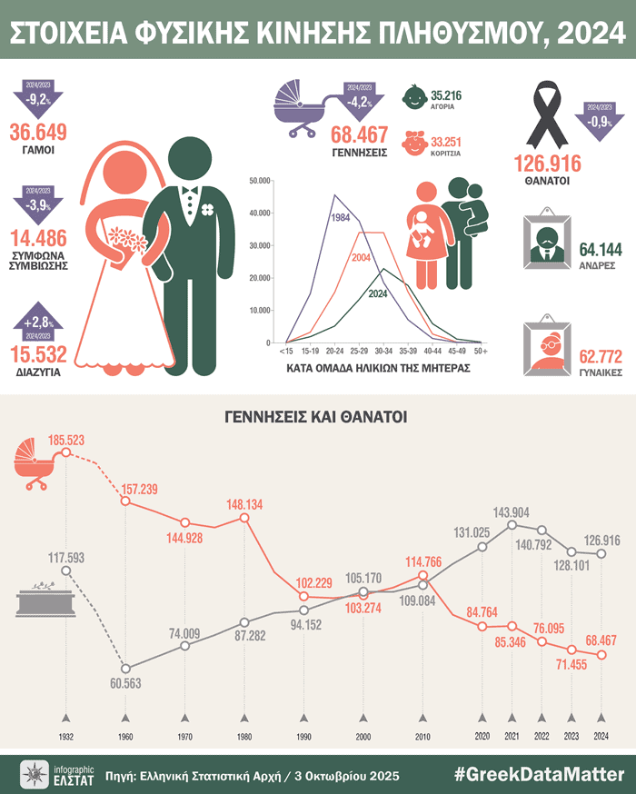 • Κατά το 2024, οι γεννήσεις στην Ελλάδα ανήλθαν σε 68.467 (35.216 αγόρια και 33.251 κορίτσια) καταγράφοντας μείωση κατά 4,2% σε σχέση με το 2023 που ήταν 71.455 (36.622 αγόρια και 34.833 κορίτσια). Η μείωση των γεννήσεων αφορά και στις αλλοδαπές μητέρες.